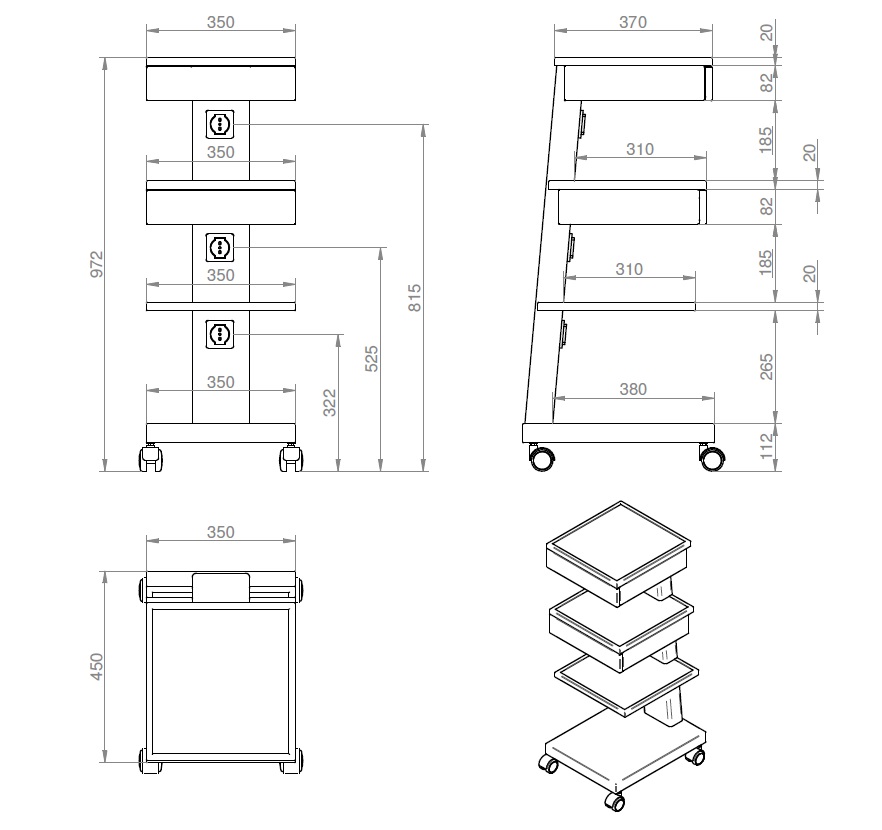 Der schmale Gerätwagen ist ein flexibler, platzsparender Wagen aus Stahl mit vier praktische Ablagen und zwei Schubladen – mobil einsetzbar in Zahnarztpraxen. Dank integriertem Handgriff, zwei Schubladen und einer großzügigen Ablagefläche unterstützt dieser Wagen effizientes Arbeiten.