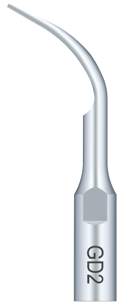 Die ZEG-Spitze GD2 ist geeignet für *(kompatible Systeme wie)* Satelec*, NSK* und DTE* Piezo Zahnsteinentferner. Sie wurde entwickelt zur supragingivalen Entfernung von Zahnstein und Ablagerungen – präzise und effizient in allen Quadranten, ideal für den Einsatz bei der professionellen Zahnreinigung (PZR).